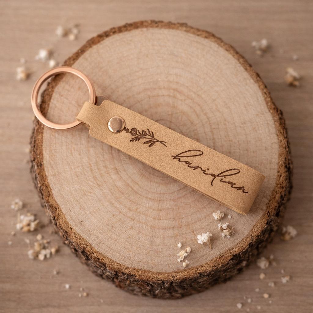 Realizado en cuero imitación piel, grabado a láser. Precioso con nombre y detalle.