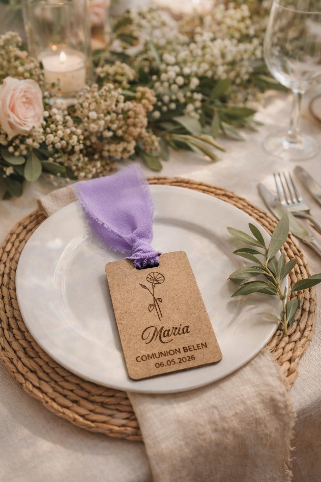 Añade un toque especial y elegante a tu mesa con nuestros marcasitios personalizados en madera, decorado con cinta de gasa deshilachada, perfecto para bodas, comuniones, bautizos y celebraciones especiales.