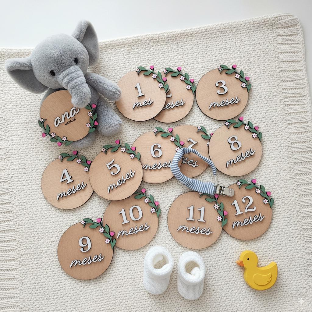 Celebra cada mes del primer año de tu bebé con este precioso set. Personalizado con el nombre del bebé pintado y grabado, el texto grabado y con el número y meses pintados a mano. Una forma única y especial de guardar recuerdos inolvidables.