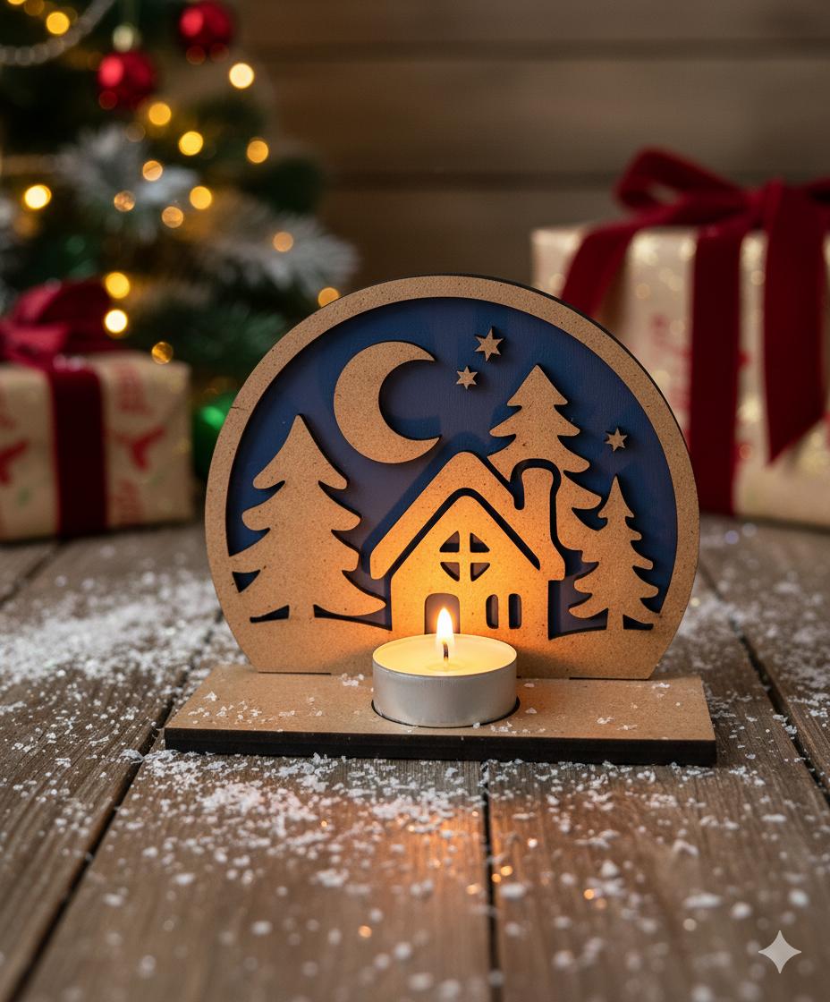 Transforma cualquier rincón de tu hogar en un refugio de calidez y fantasía navideña con nuestro exclusivo portavelas de madera. Cada pieza es una pequeña obra de arte que evoca la dulzura de una noche invernal, con su diseño encantador de casita acogedora entre pinos nevados, bajo la luz de la luna y las estrellas.