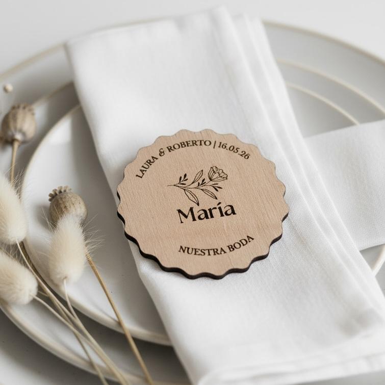 Añade un toque especial y elegante a la decoración de tu boda con nuestros marcasitios de madera personalizados. Diseñados para colocar sobre el plato o junto a la servilleta, estos detalles no solo ayudan a organizar a los invitados en las mesas, sino que también se convierten en un bonito recuerdo del gran día.