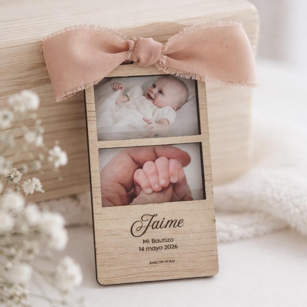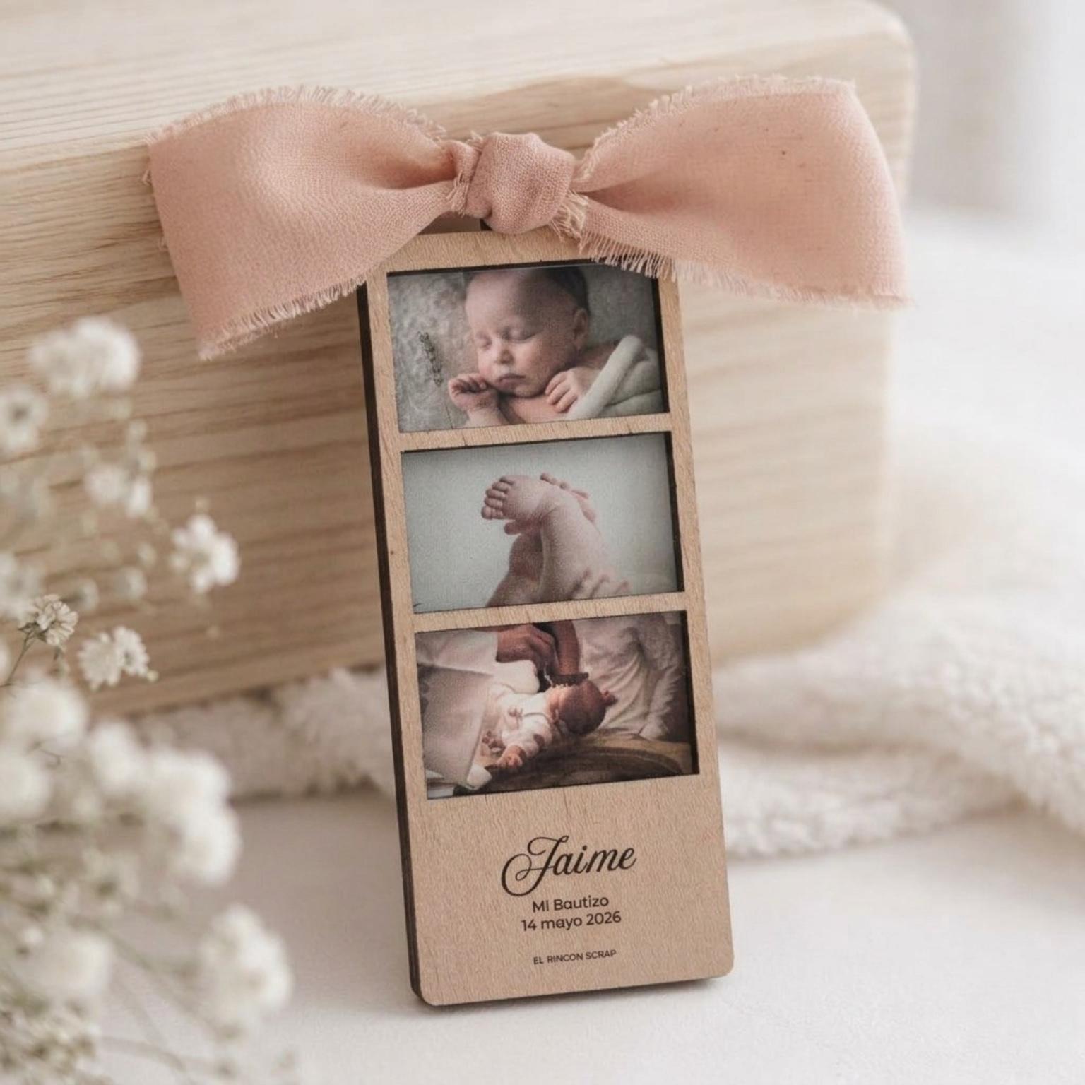 Un recuerdo único para un día inolvidable. Nuestro marco estilo fotomatón en madera recoge los momentos más especiales del bau en un diseño delicado y lleno de emoción, con cinta deshilachada como adorno y grabada con láser.