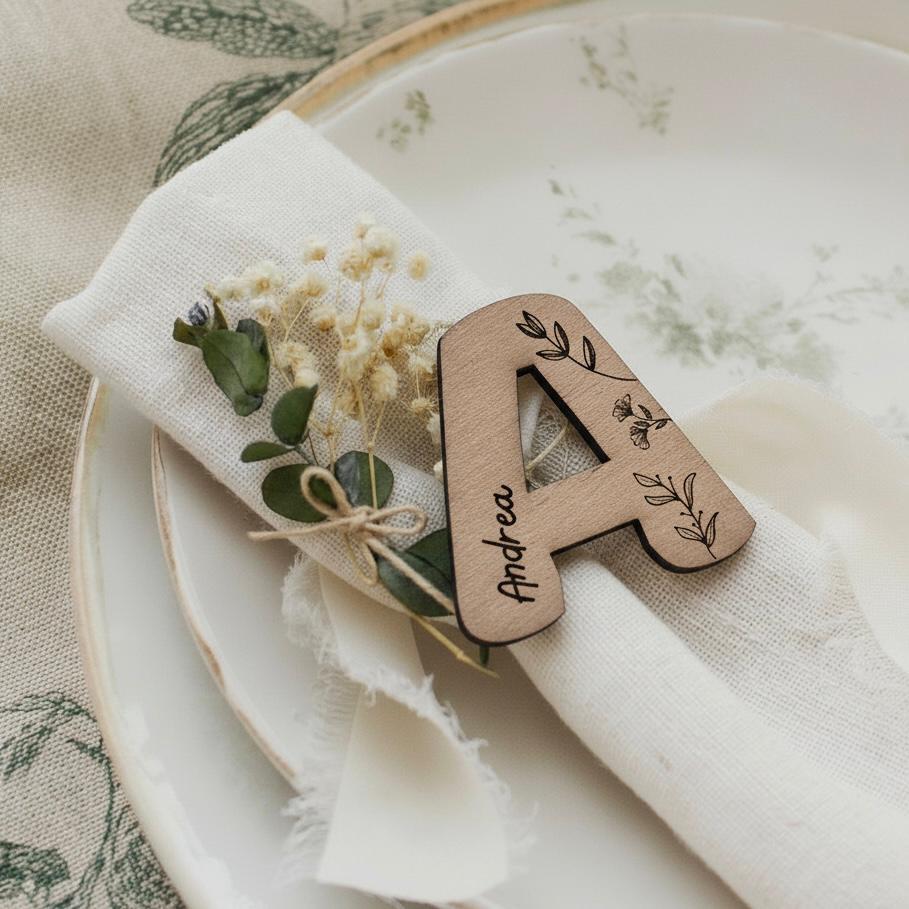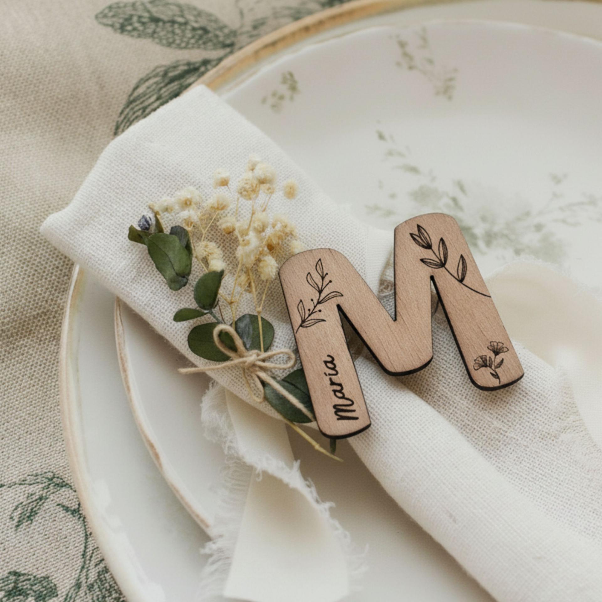 Dale un toque único y elegante a tu evento con nuestros marcasitios personalizados en madera de 5 mm, diseñados con la inicial y el nombre de cada invitado. Una pieza delicada y especial que no solo organiza tu mesa, sino que también se convierte en un bonito recuerdo para quienes te acompañan en un día tan importante.