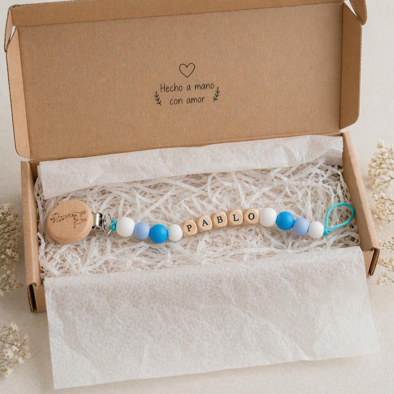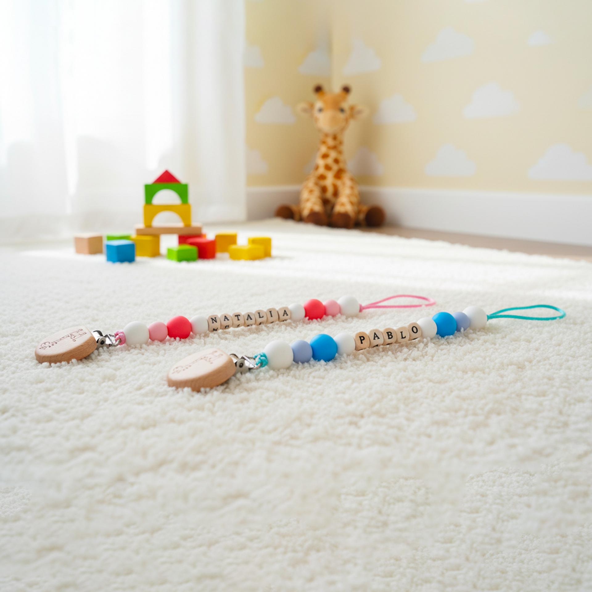 Cada chupetero incluye el nombre del bebé en cuentas personalizadas, convirtiéndolo en una pieza exclusiva y muy especial, ideal para regalar en nacimientos, baby showers o crear una canastilla inolvidable.