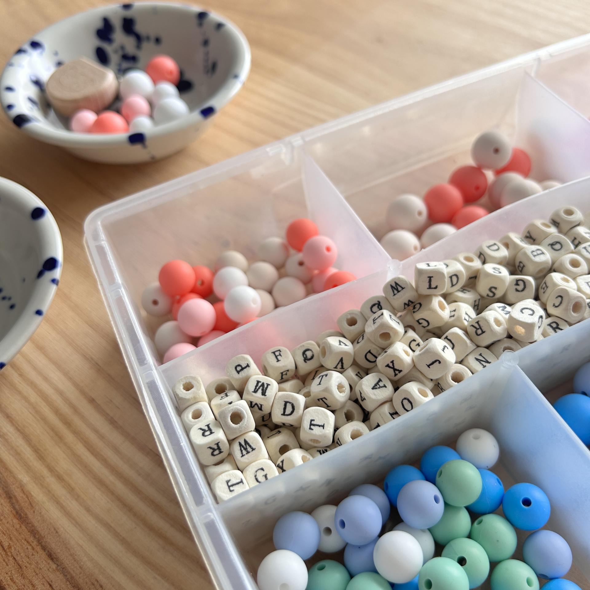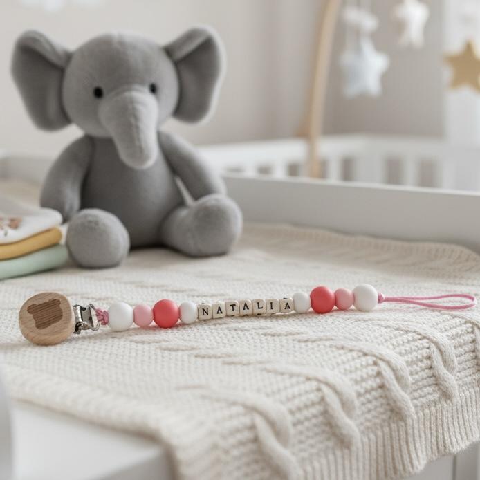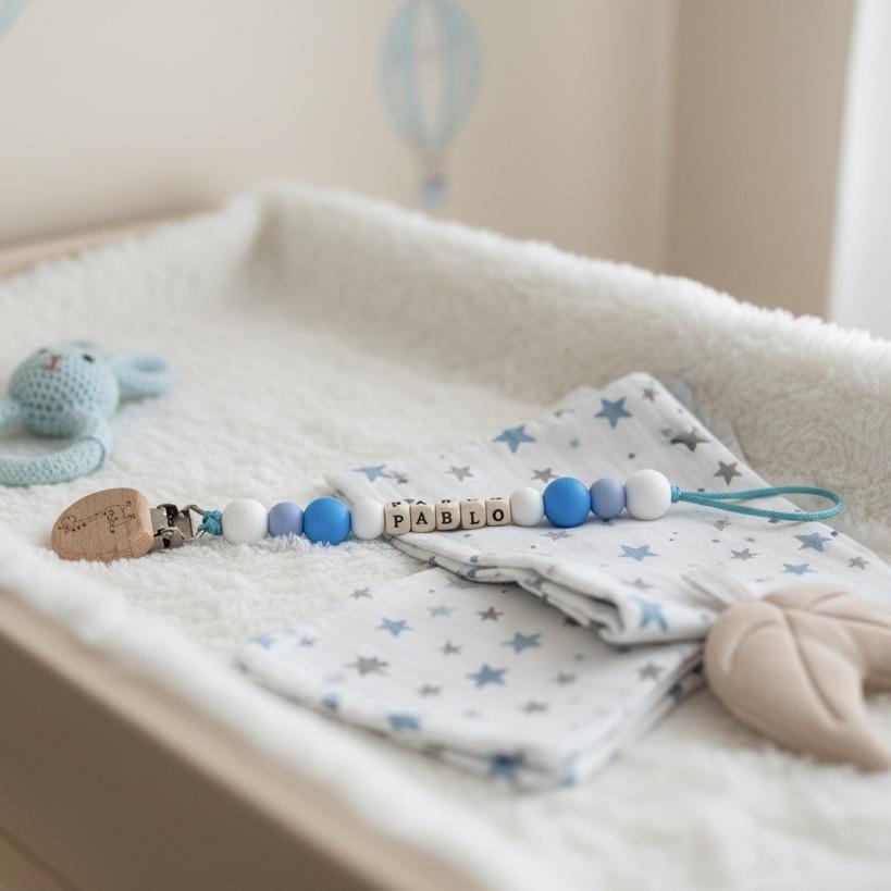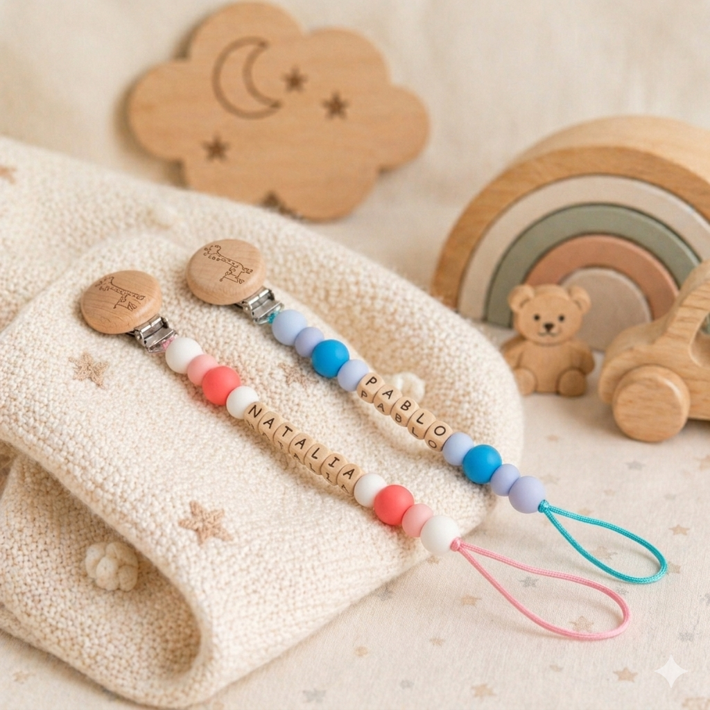 Cada chupetero incluye el nombre del bebé en cuentas personalizadas, convirtiéndolo en una pieza exclusiva y muy especial, ideal para regalar en nacimientos, baby showers o crear una canastilla inolvidable.
