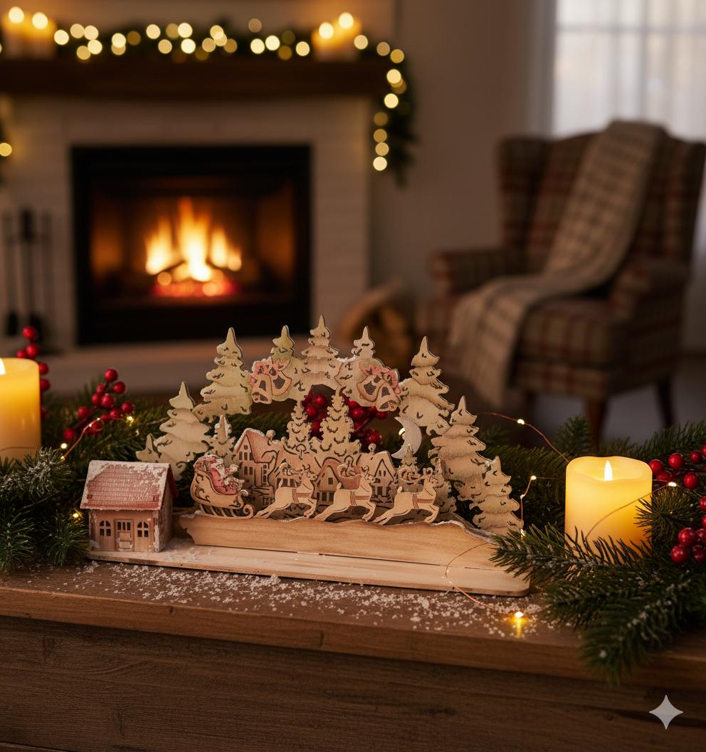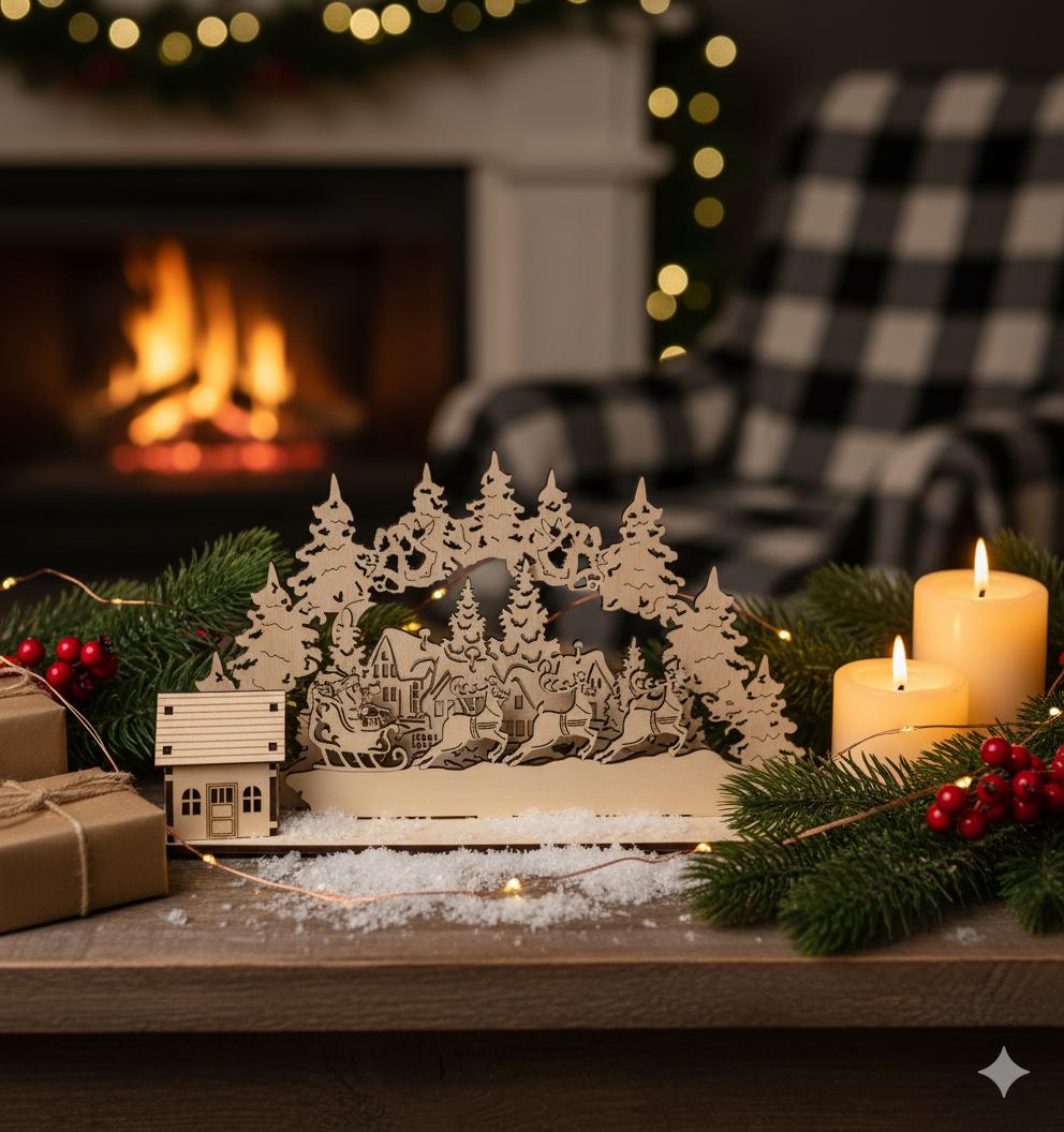 Escena Navideña Papá Noel Con Renos Madera De Chopo Hausa