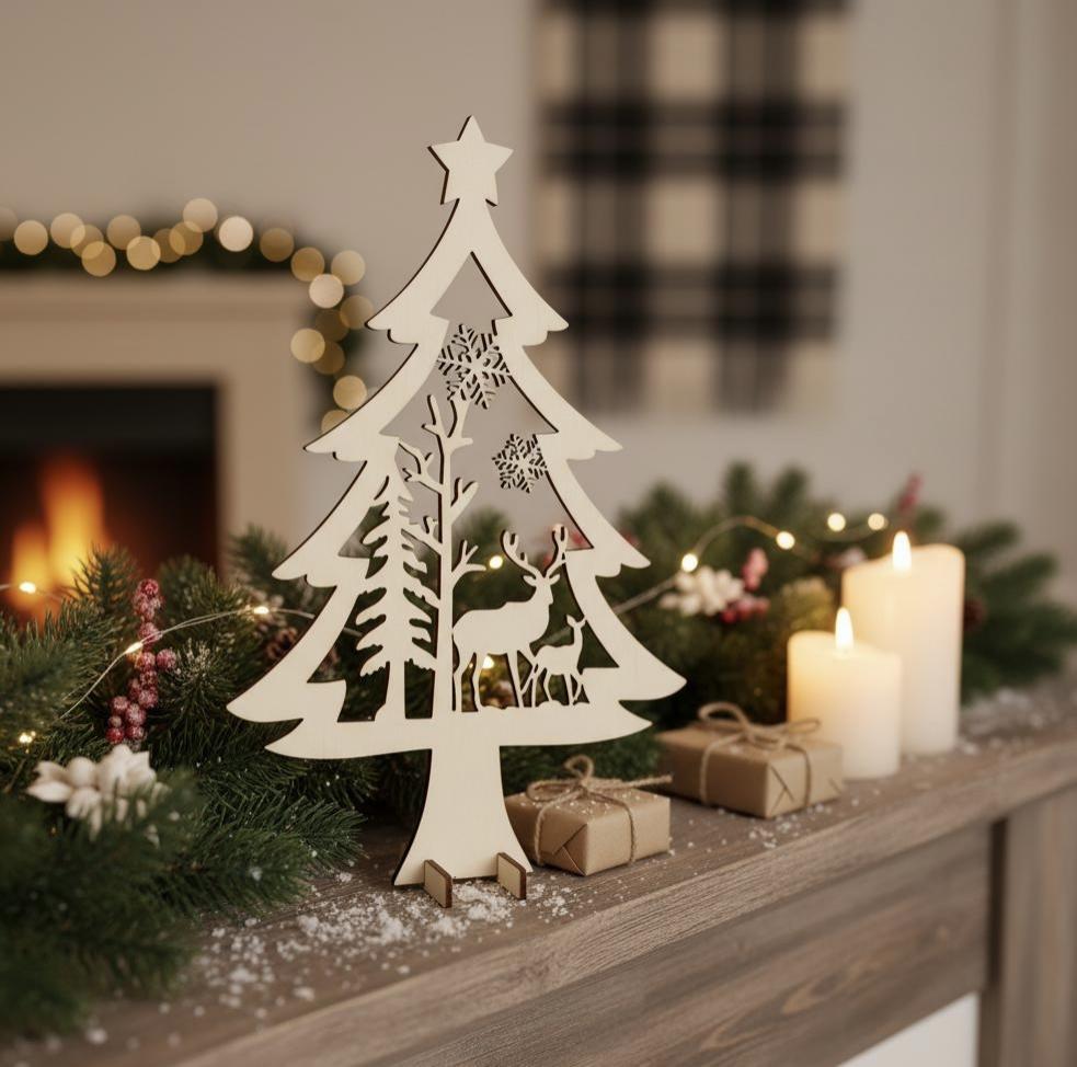 Escena invernal dentro de un bonito árbol de chopo calado. Es ideal para navidad con una bonita estrella en la cúpula. Al ser madera podemos aplicar todo tipo de técnicas para decorarlo al gusto.